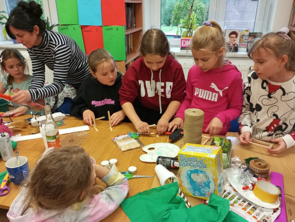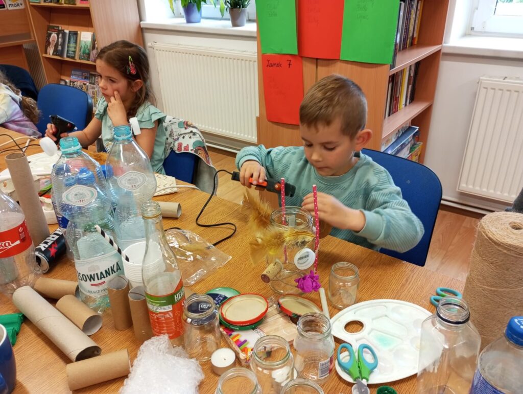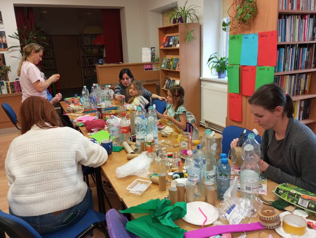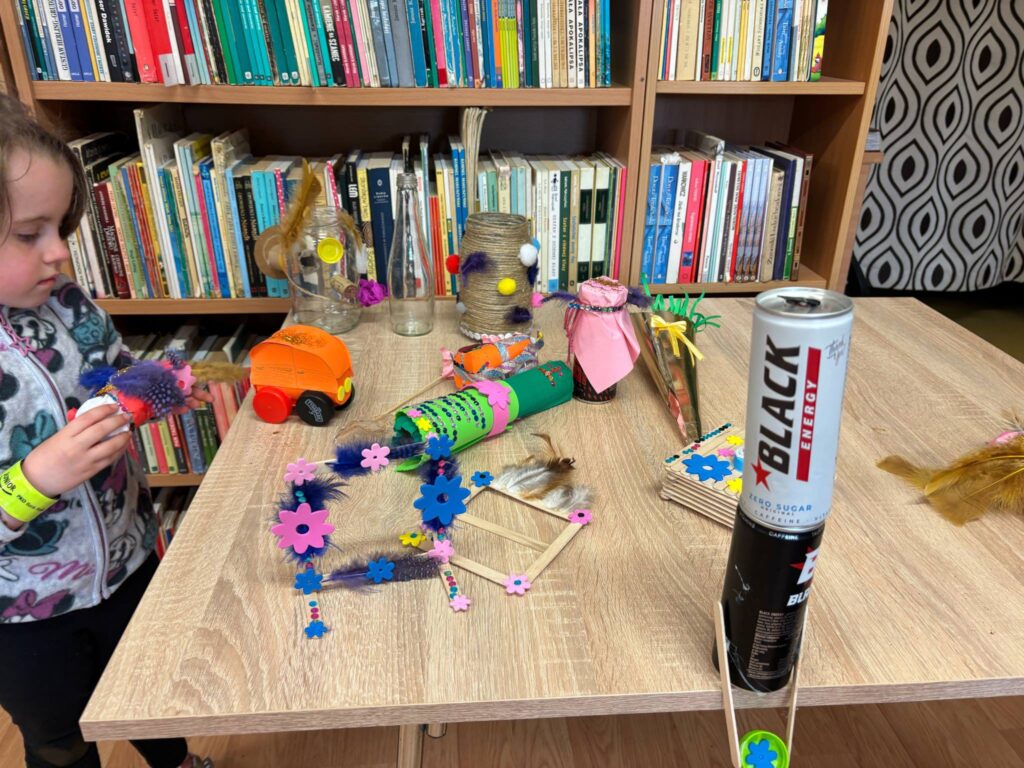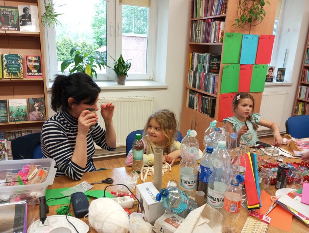 11 maja w kalendarzu widnieje dzień bez śmiecenia, w związku z tym postanowiliśmy to uczcić i zorganizowaliśmy Międzypokoleniowe Warsztaty Artystyczne pn. „Dzień bez śmiecenia- moc czystości”. Tym razem 22 maja spotkaliśmy się w Gminnej Bibliotece Publicznej w Złotniku, w której mieliśmy przyjemności wykorzystywać śmieci
