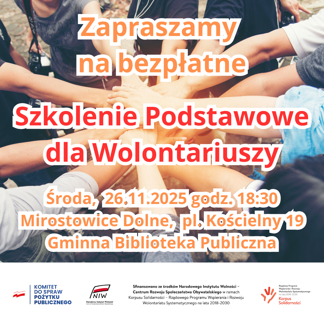 Zapraszamy na bezpłatne Szkolenie Podstawowe dla Wolontariuszy w ramach #KorpusSolidarności, które odbędzie się 26.11.2025 r. o godz. 18:30 w Gminnej Bibliotece Publicznej w Mirostowicach Dolnych przy pl. Kościelny 19, 68-205 Mirostowice Dolne.