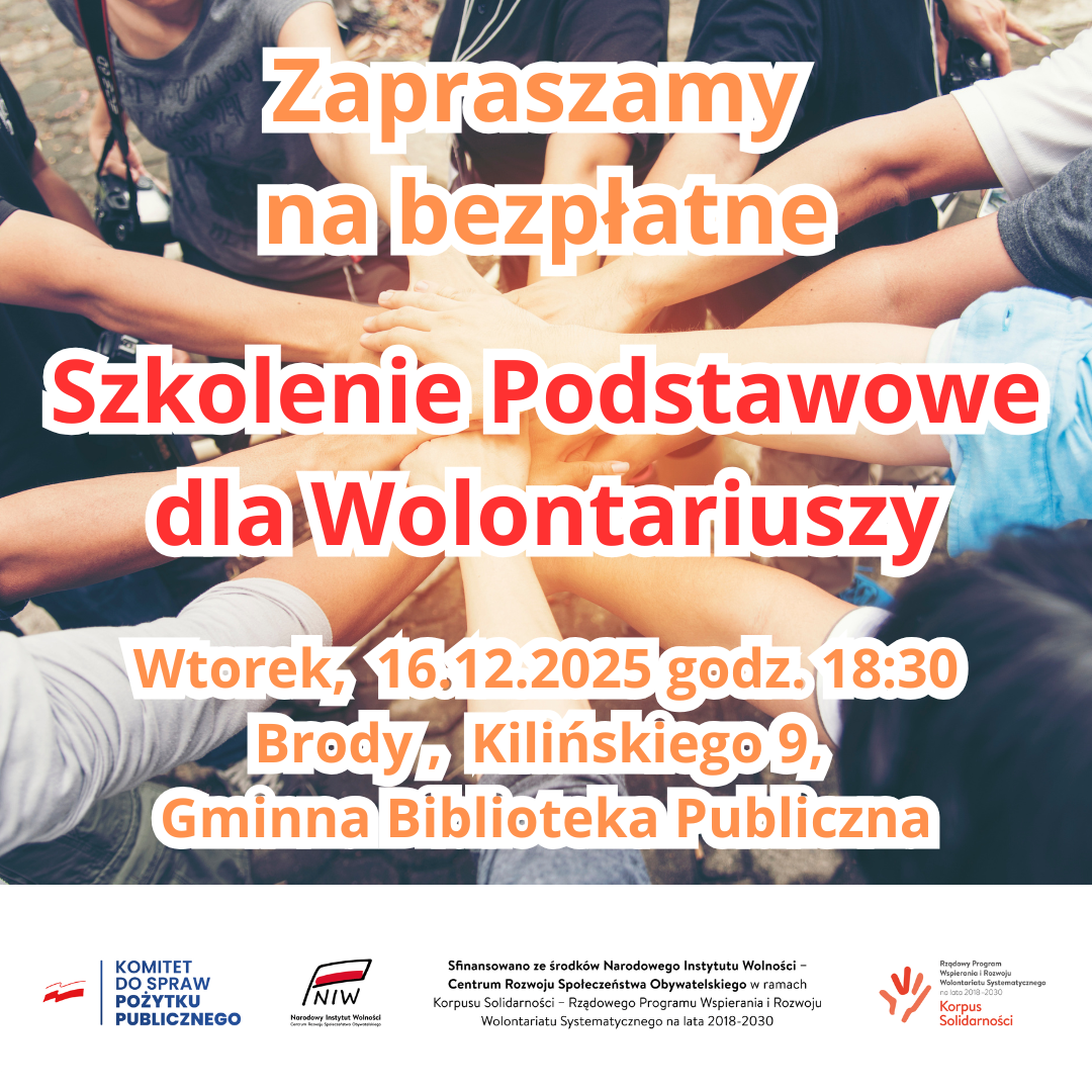 Zapraszamy na bezpłatne Szkolenie Podstawowe dla Wolontariuszy w ramach #KorpusSolidarności, które odbędzie się 16.12.2025 r. o godz. 18:30 w Gminnej Bibliotece Publicznej w Brodach przy ul. Kilińskiego 9, 68-343 Brody.