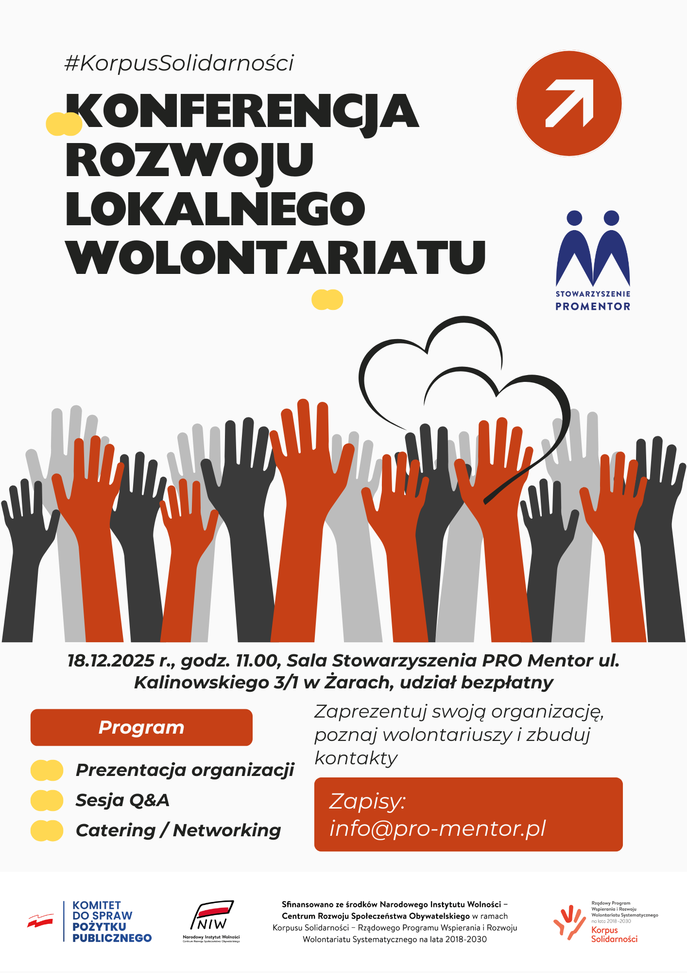 Zapraszamy serdecznie przedstawicieli i członków organizacji pozarządowych, stowarzyszeń, fundacji, kół gospodyń wiejskich, klubów do udziału w Konferencji Rozwoju Lokalnego Wolontariatu. Konferencja odbędzie się 18 grudnia 2025 roku, start o godz. 11:00 w Sali Stowarzyszenia PRO Mentor przy ul. Kalinowskiego 3/1. Udział bezpłatny. Konferencja jest znakomitą okazją do zaprezentowania swoich działań, pozyskania wolontariuszy oraz networkingu.