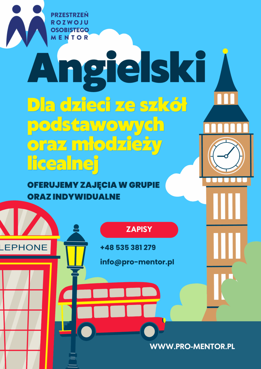 Zwiększ pewność siebie swojego dziecka w posługiwaniu się językiem angielskim! Zajęcia z angielskiego w PRO Mentor to idealny sposób, by Twoje dziecko rozwinęło swoje umiejętności językowe w przyjaznej atmosferze. Przygotowujemy do egzaminu ósmoklasisty, matury oraz pomagamy poprawić oceny w szkole. Nasza oferta: Wybierz formę zajęć, która najlepiej pasuje do Waszych potrzeb: Lekcje odbywają się w…