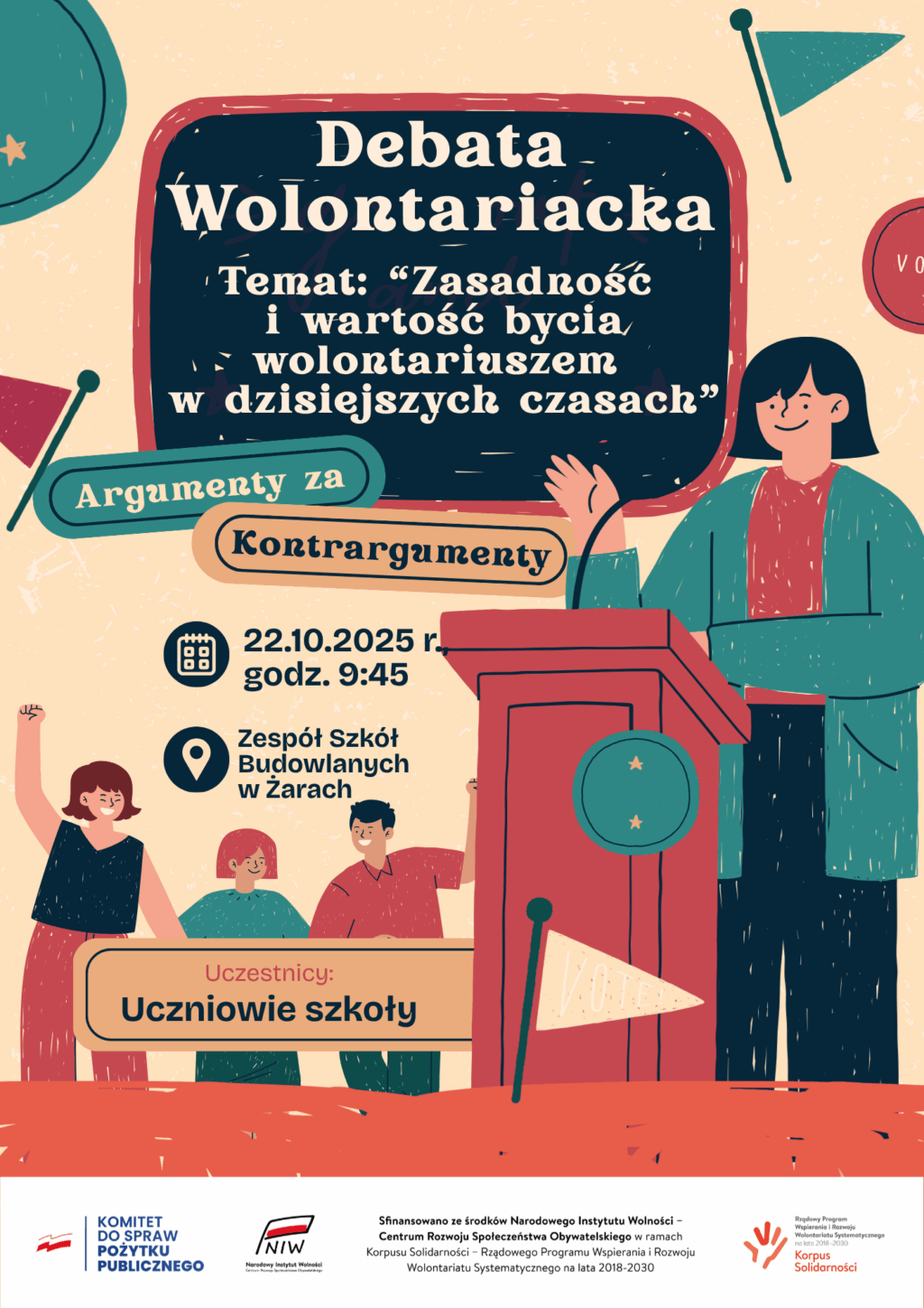 Witajcie! 22 października 2025 r. o godz. 9:45 w Zespole Szkół Budowlanych w Żarach odbędzie się Debata Wolontariacka! Tematem przewodnim debaty będzie: „Zasadność i wartość bycia wolontariuszem w dzisiejszych czasach”. Zapraszamy serdecznie uczniów i nauczycieli. Projekt sfinansowany ze środków Narodowego Instytutu Wolności – Centrum Rozwoju Społeczeństwa Obywatelskiego w ramach Korpusu Solidarności – Rządowego Programu Wspierania…