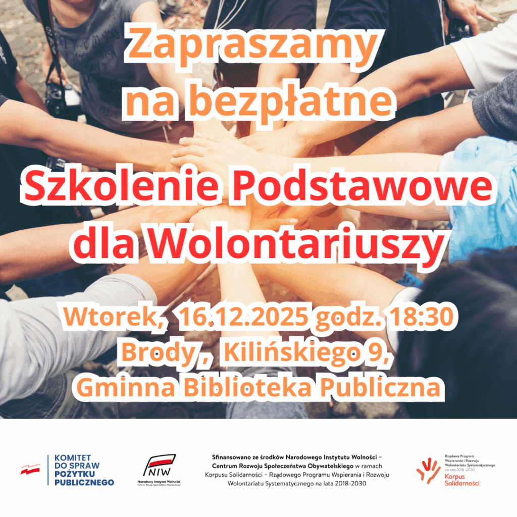 Zapraszamy na bezpłatne Szkolenie Podstawowe dla Wolontariuszy w ramach #KorpusSolidarności, które odbędzie się 16.12.2025 r. o godz. 18:30 w Gminnej Bibliotece Publicznej w Brodach przy ul. Kilińskiego 9, 68-343 Brody. Projekt sfinansowany ze środków Narodowego Instytutu Wolności – Centrum Rozwoju Społeczeństwa Obywatelskiego w ramach Korpusu Solidarności – Rządowego Programu Wspierania i Rozwoju Wolontariatu Systematycznego na…