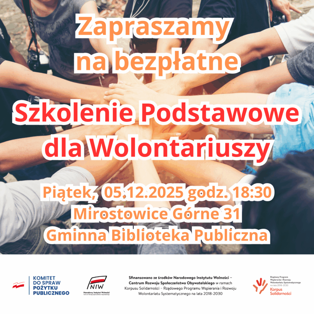 Zapraszamy na bezpłatne Szkolenie Podstawowe dla Wolontariuszy w ramach #KorpusSolidarności, które odbędzie się 26.11.2025 r. o godz. 18:30 w Gminnej Bibliotece Publicznej w Mirostowicach Dolnych przy pl. Kościelny 19, 68-205 Mirostowice Dolne. Projekt sfinansowany ze środków Narodowego Instytutu Wolności – Centrum Rozwoju Społeczeństwa Obywatelskiego w ramach Korpusu Solidarności – Rządowego Programu Wspierania i Rozwoju Wolontariatu…